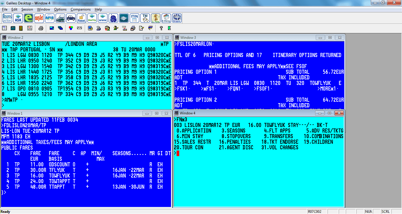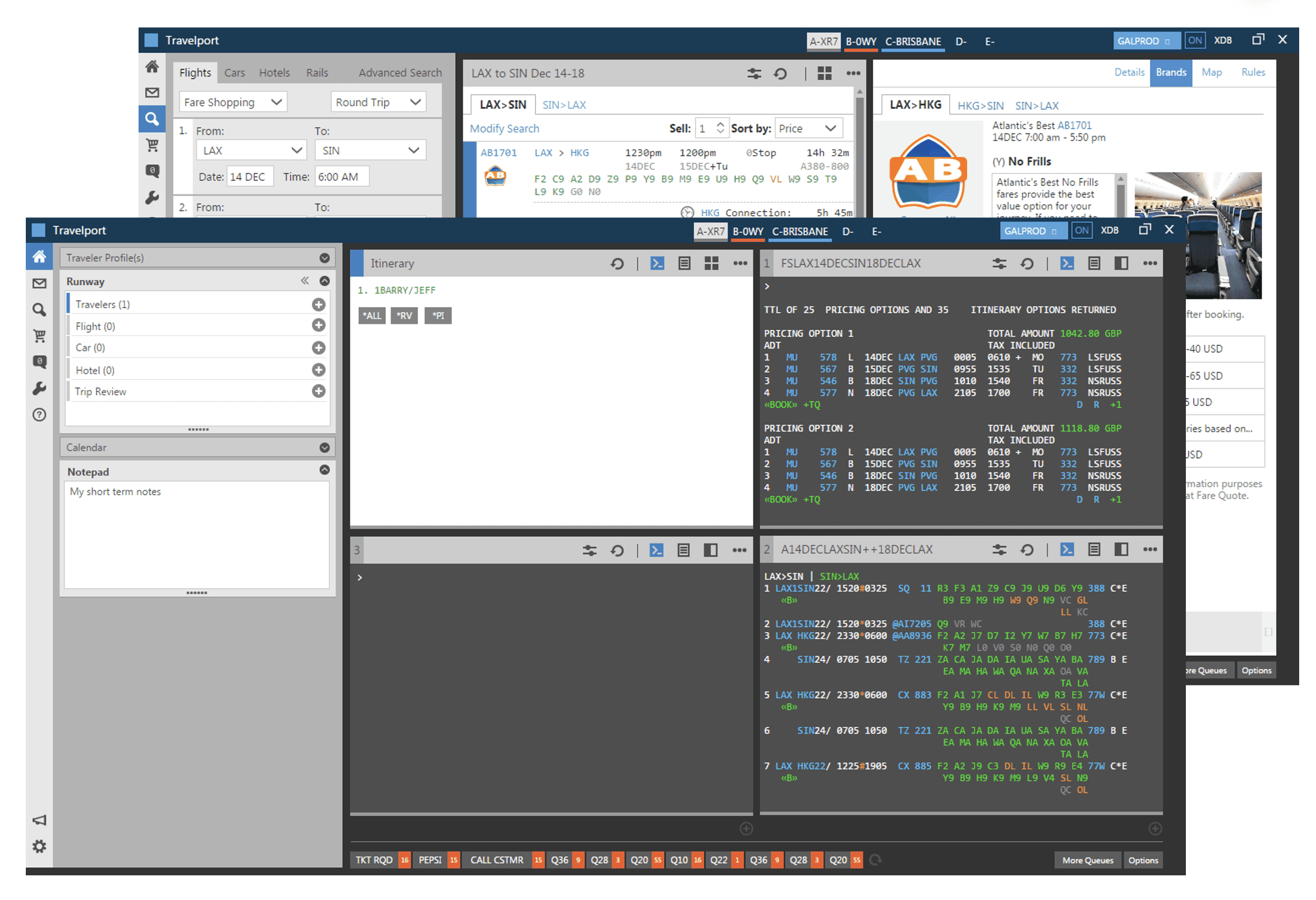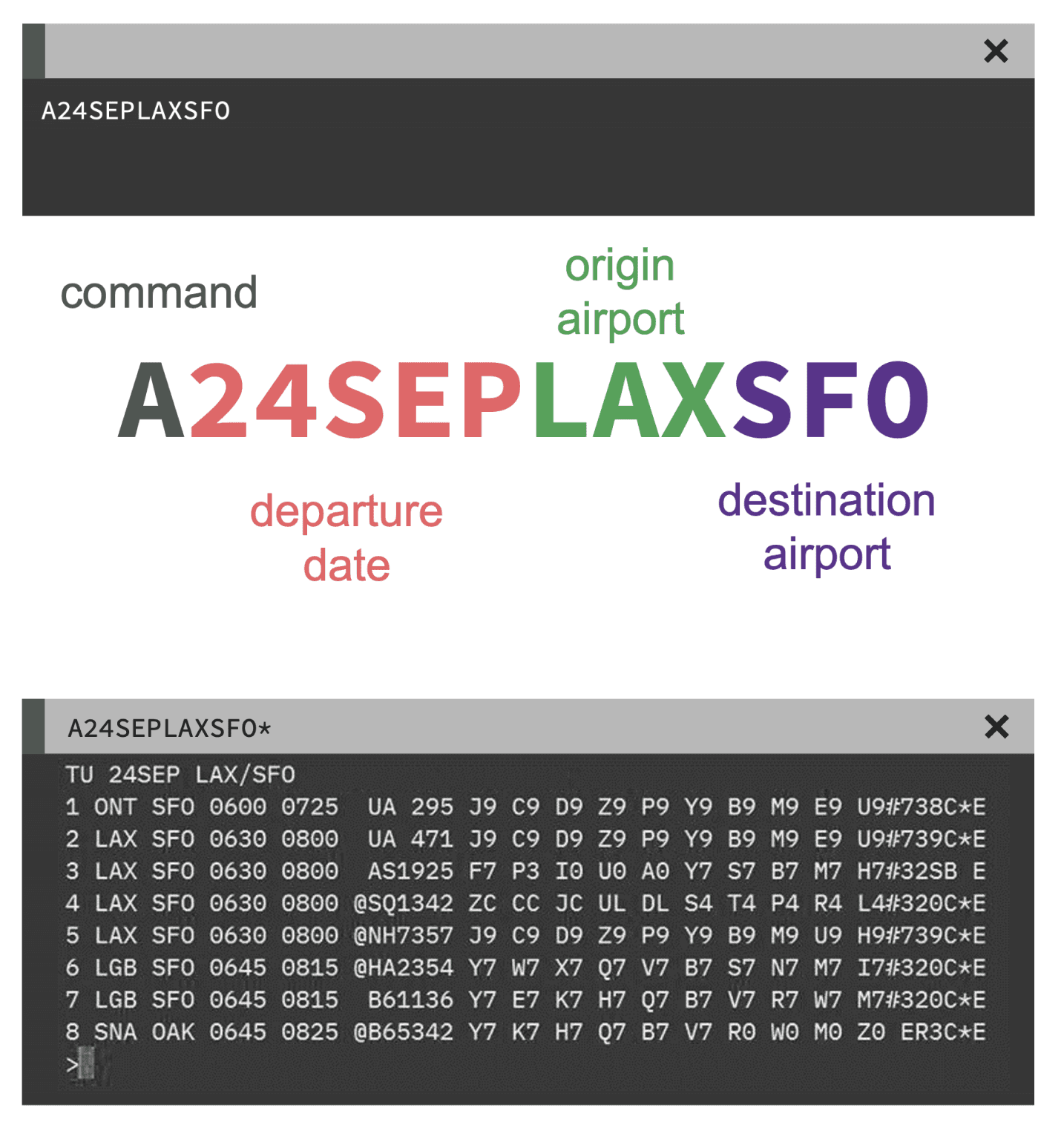 - Command-driven: Agents enter short codes and modifiers—cryptic commands followed by arguments—to search, book, or modify flights.