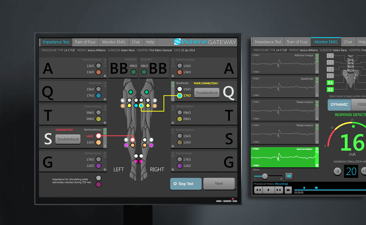 I designed the UI/UX for ProNerve’s (now SpecialtyCare) intraoperative neuromonitoring (IONM) application, which enables clinicians to monitor a patient’s central nervous system—including the brain, spinal cord, and nerves—during surgeries where these systems are at risk. The design challenge was to create a UI that clearly surfaced critical changes and alerted medical staff to potential issues at a glance, ensuring rapid awareness and response in high-stakes surgical environments.